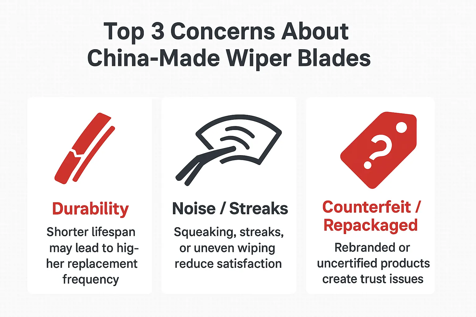 Se você é proprietário ou distribuidor de uma oficina mecânica, ainda pode hesitar em comprar palhetas de limpador da China. Talvez você já tenha ouvido histórias de riscos, rangidos ou peças que se desgastam muito rapidamente. Ou talvez alguém tenha mencionado um lote que não coube corretamente. Estas experiências, embora reais em alguns casos, muitas vezes provêm de fornecedores desatualizados ou de novas marcas de baixo custo – e não de fabricantes modernos e certificados.