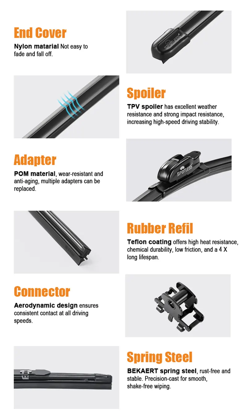 Nem todos os plásticos e borrachas são iguais. Usamos borracha natural importada com tratamento de Teflon para uma limpeza suave e silenciosa. As molas são de aço Bekaert de alta qualidade, tratadas termicamente para uma pressão consistente. As carcaças e as tampas das extremidades são feitas de náilon reforçado com PA66, que resiste ao calor, à umidade e ao desgaste. Cada escolha visa evitar os problemas que os distribuidores costumam ver com lâminas mais baratas: riscos, rangidos ou falhas prematuras.